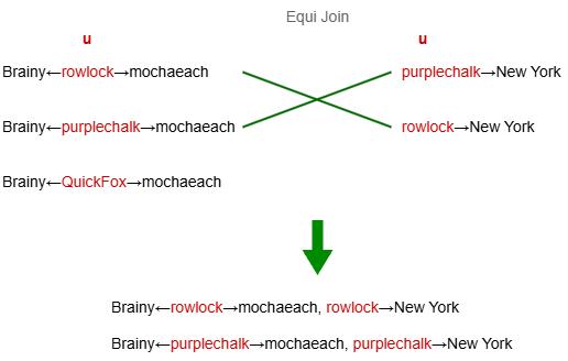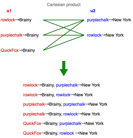 语句中的两个路径模式没有声明共同变量,因此进行笛卡尔乘积,即将一个结果集中的每一行与另一个中的每一行进行连接。