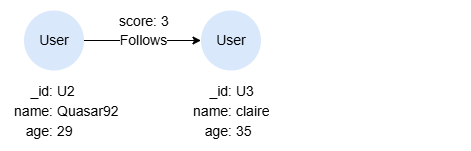 [(:User {_id:"U1", name:"rowlock", age:24}), (:User {_id:"U2", name:"Quasar92", age:29})] | [(:User {_id:"U2", name:"Quasar92", age:29}), (:User {_id:"U3", name:"claire", age:35})] |