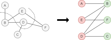 这是一个示例的二分图,它的节点可以划分至集合V1 = {A, D, E}和V2 = {B, C, F}。