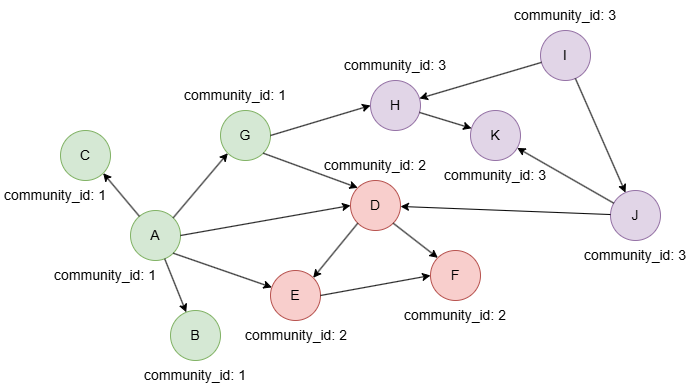 insert().into(@default).nodes([{_id:"A", community_id: 1}, {_id:"B", community_id: 1}, {_id:"C", community_id: 1}, {_id:"D", community_id: 2}, {_id:"E", community_id: 2}, {_id:"F", community_id: 2}, {_id:"G", community_id: 1}, {_id:"H", community_id: 3}, {_id:"I", community_id: 3}, {_id:"J", community_id: 3}, {_id:"K", community_id: 3}]);