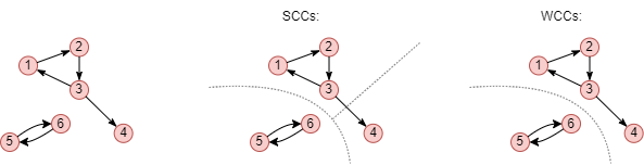 与连通分量相关有两个重要概念——弱连通分量(Weakly Connected Component, WCC)和强连通分量(Strongly Connected Component, SCC):