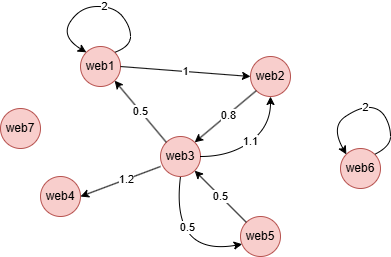 insert().into(@link).edges([{_from:"web1", _to:"web1",value:2}, {_from:"web1", _to:"web2",value:1}, {_from:"web2", _to:"web3",value:0.8}, {_from:"web3", _to:"web1",value:0.5}, {_from:"web3", _to:"web2",value:1.1}, {_from:"web3", _to:"web4",value:1.2}, {_from:"web3", _to:"web5",value:0.5}, {_from:"web5", _to:"web3",value:0.5}, {_from:"web6", _to:"web6",value:2}]);
