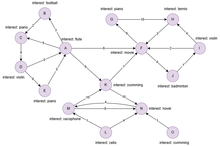 insert().into(@user).nodes([{_id:"A",interest:"flute"}, {_id:"B",interest:"football"}, {_id:"C",interest:"piano"}, {_id:"D",interest:"violin"}, {_id:"E",interest:"piano"}, {_id:"F",interest:"movie"}, {_id:"G",interest:"piano"}, {_id:"H",interest:"tennis"}, {_id:"I",interest:"violin"}, {_id:"J",interest:"badminton"}, {_id:"K",interest:"swimming"}, {_id:"L",interest:"cello"}, {_id:"M",interest:"saxophone"}, {_id:"N",interest:"novel"}, {_id:"O",interest:"swimming"}]);