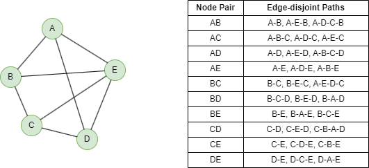 下面展示的是一个具有3边连通性的图以及每对节点之间的所有边不相交路径。