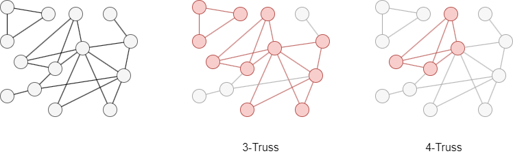 Truss的概念是根据对社交凝聚力的观察而提出的:如果两个人关系紧密,他们很可能也与他人有共同联系。由此创建k-Truss:A和B之间的连接只有在至少k-2个其他人的支持下才被认为是合法的,这些人分别与A和B有连接。换句话说,k-Truss中每条边所连接的两个节点至少有k–2个共同邻居。
