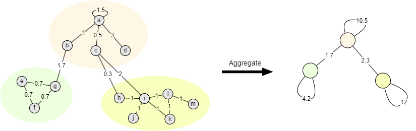 在第二阶段,每个社区被压缩成一个节点,每个聚合节点带有一条自环边,其权重等于社区内部权重。新节点之间边的权重是两个对应社区中节点之间边的权重之和。