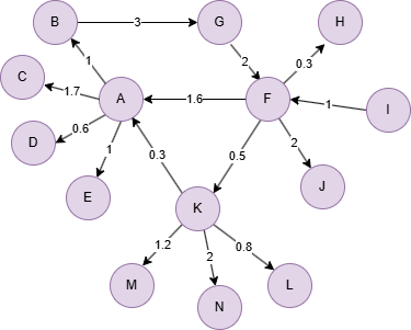 insert().into(@default).edges([{_from:"A", _to:"B", weight:1}, {_from:"A", _to:"C", weight:1.7}, {_from:"A", _to:"D", weight:0.6}, {_from:"A", _to:"E", weight:1}, {_from:"B", _to:"G", weight:3}, {_from:"F", _to:"A", weight:1.6}, {_from:"F", _to:"H", weight:0.3}, {_from:"F", _to:"J", weight:2}, {_from:"F", _to:"K", weight:0.5}, {_from:"G", _to:"F", weight:2}, {_from:"I", _to:"F", weight:1}, {_from:"K", _to:"A", weight:0.3}, {_from:"K", _to:"M", weight:1.2}, {_from:"K", _to:"N", weight:2}, {_from:"K", _to:"L", weight:0.8}]);