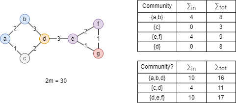以上图为例,当前在同一社区的节点用同一颜色表示。如果现在考虑节点d,将其重新分配至社区{a,b}、{c}或{e,f}分别所产生的模块度增益如下:
