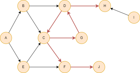 在以下的示例中,首先忽略环路中的节点C、D和G,其次忽略从环路节点出边可达的其他节点,包括节点F、J和H。下图拓扑排序结果为:A, I, B, E。
