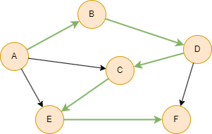 在下面的示例中,图中的节点只有1种可能的排序:A, B, D, C, E, F。