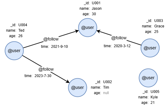 insert().into(@user).nodes([{_id:"U001", name:"Jason", age:30}, {_id:"U002", name:"Tim"}, {_id:"U003", name:"Grace", age:25}, {_id:"U004", name:"Ted", age:26}, {_id:"U005", name:"Kyle", age:21}])