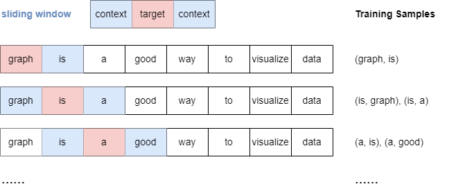 Skip-gram模型采用滑动窗口采样(Sliding Window Sampling)技术来生成训练样本。这种方法使用一个“窗口”,依次将窗口的中心目标位置放在句子中的每个单词上。目标单词分别与它前后范围在window_size
