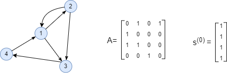 节点的分值可通过递归的方式计算。以下图为例,邻接矩阵A反映每个节点的入边。将所有节点的分值初始化为1,并用向量s(0)表示。