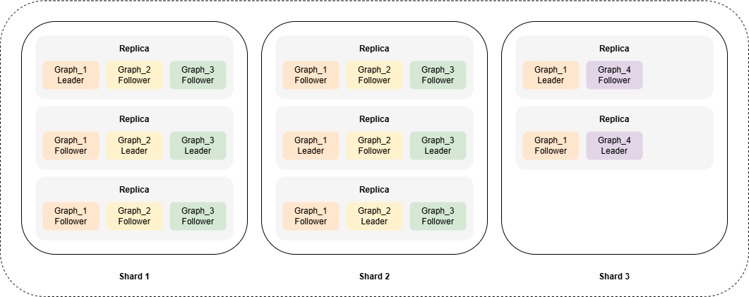 有两个副本。数据库中的图分布存储在这些Shard中,其中Graph_1