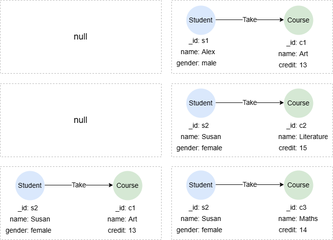 本条查询意在判断图中每对学生和课程之间是否存在路径。请注意,WITH语句对s和c执行了笛卡尔积操作,因此有6条记录生成。n().e().n()语句随后执行6次,逐条处理每条记录。更多信息请参阅异源数据。
